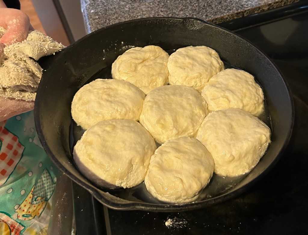 Tip: If you want a crunchy bottom on your biscuit, heat the skillet and 3 T. oil on top of the stove while you cut out the biscuits and turn them over in the hot grease. You want it as hot as you can get it–almost to the point it flames. The biscuits will sizzle when they hit the pan.