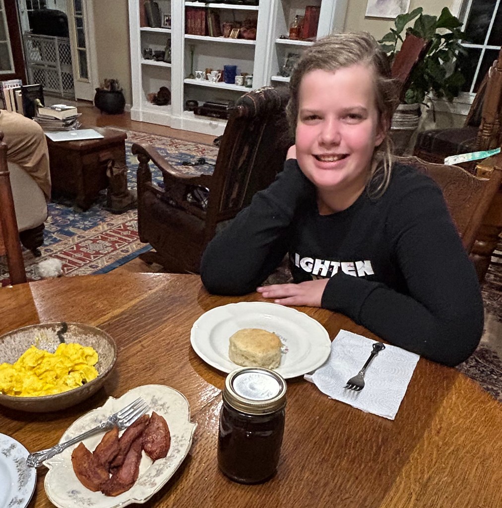 We decided to do breakfast for supper. Bella is putting on a pan of bacon and she is about to scramble six big brown eggs from our chickens. Proud of those girls! They are laying 18-20 eggs a day. Guess they are like the goose that laid the golden egg with prices up close to 8 dollars a dozen!