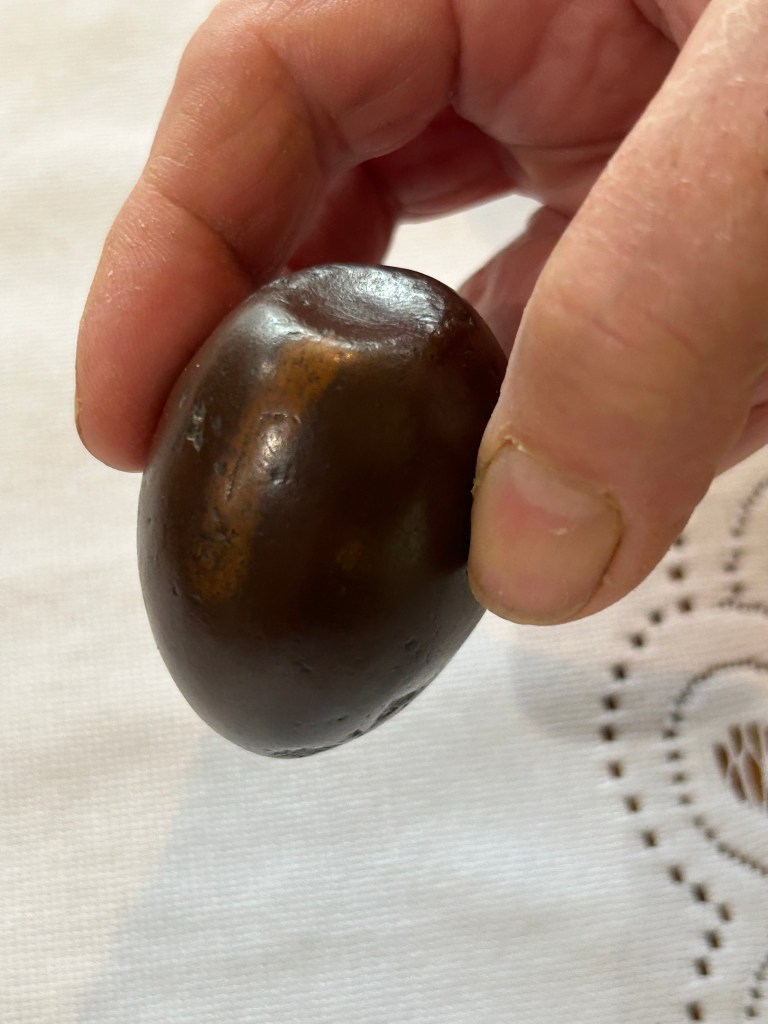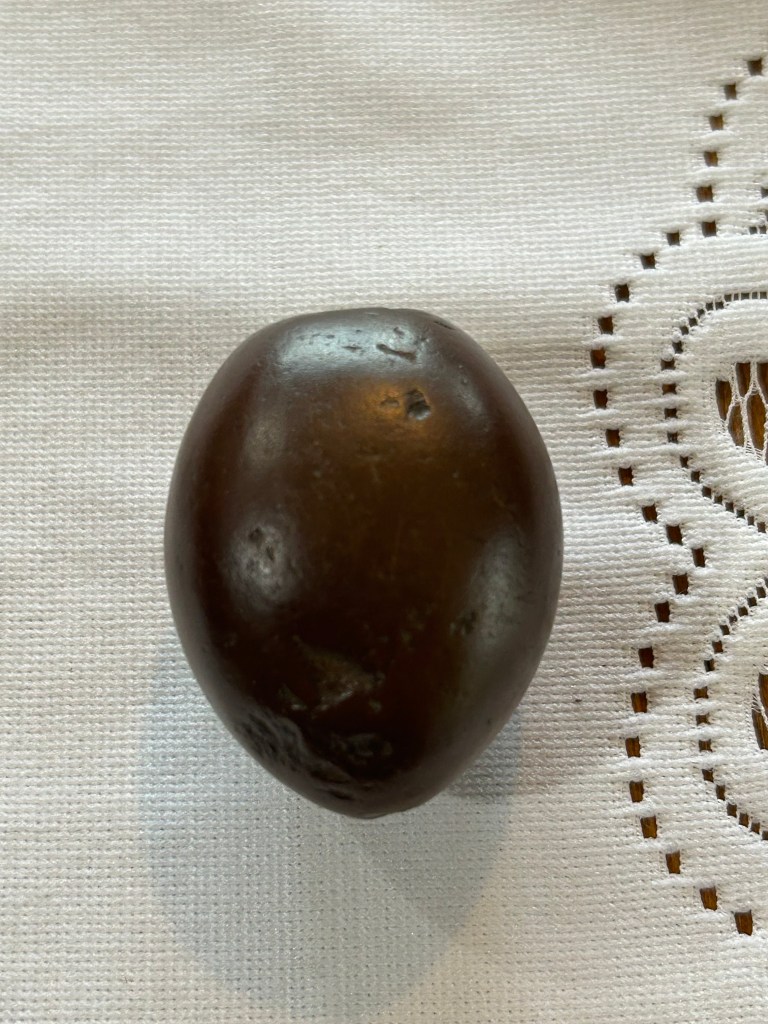 This week’s Timeless Treasure is really a continuation of last week’s–the leather wallet belonging to Bella’s great-great-great-great-grandfather, the American Indian slave who fought in the Mexican War. His wife, Bella’s 4th great-grandmother, was Mary Elizabeth Yates. This egg-shaped rock belonged to her.