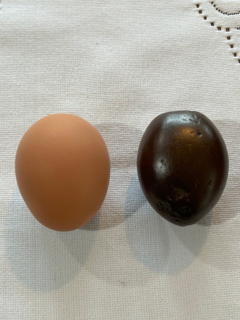 It is the exact size and shape of a peeled, hard boiled egg. It even has the little dimple in the top!
