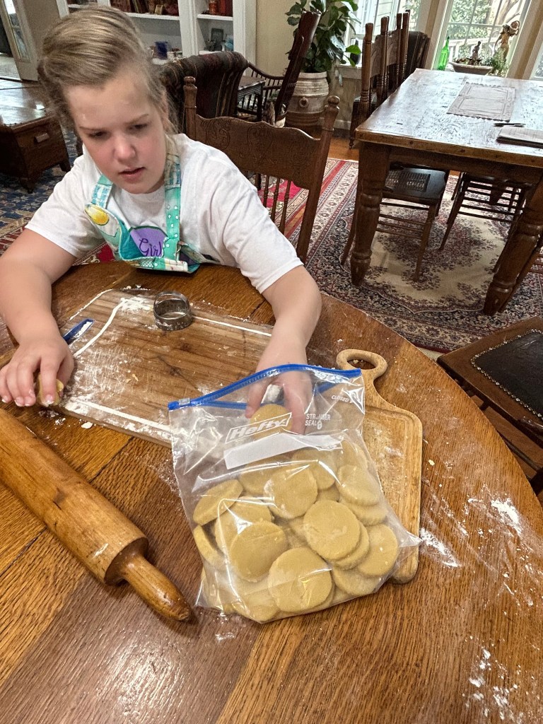 TIP: I cut all of the cookies out at one time and store them in a ziplock bag in the refrigerator. That way I can pull out just 5 or 6 to bake and not have to fool with rolling out the dough again!