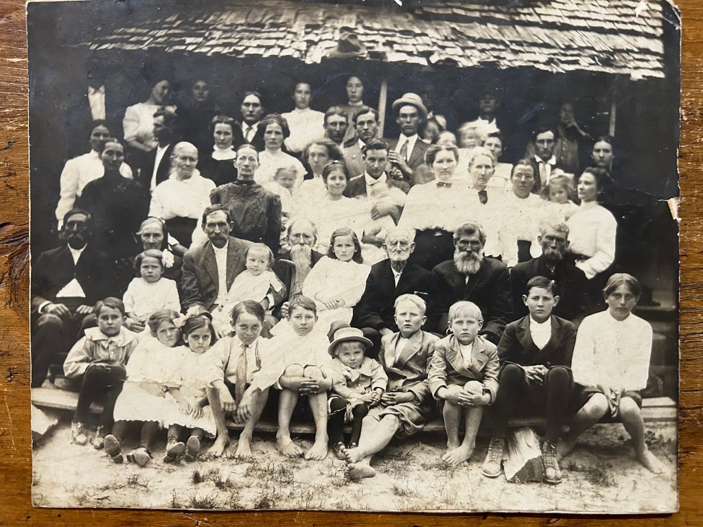 The old photo below was taken at his 99th birthday in 1910. Many of Bella’s Williams ancestors are pictured. My grandfather, Aubrey Shuck Williams and his brothers are three of the little boys on the bottom front row.