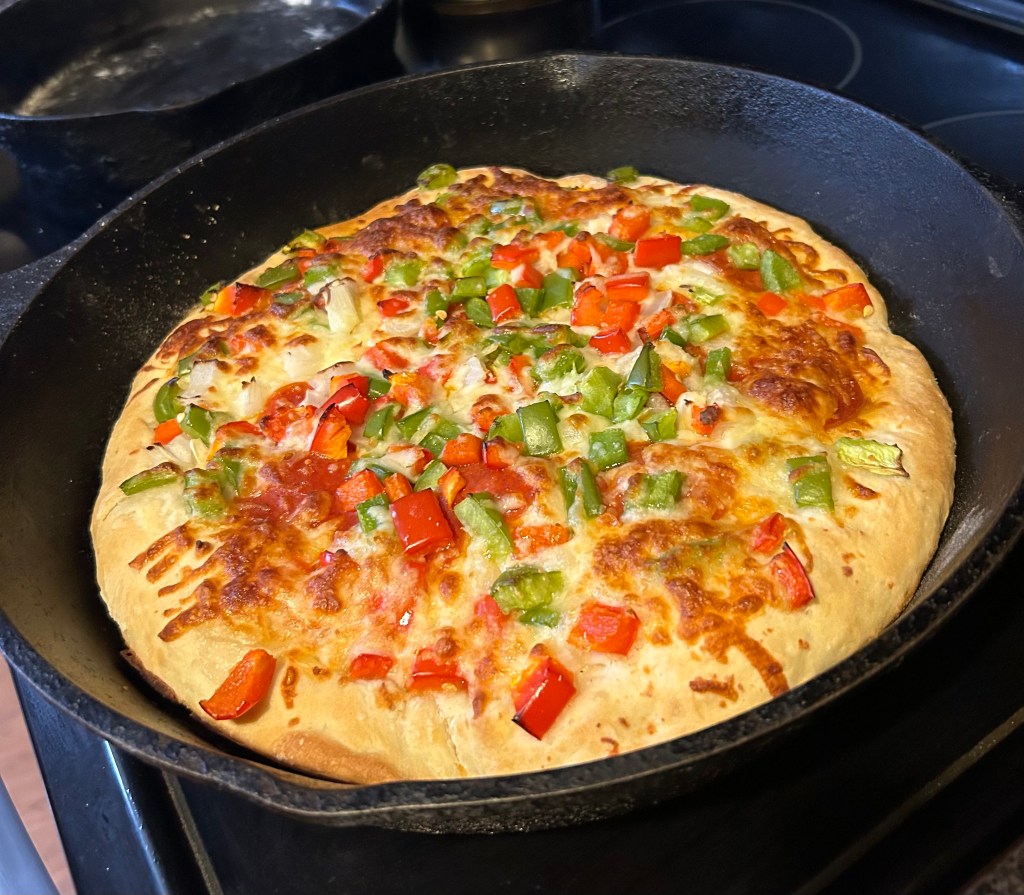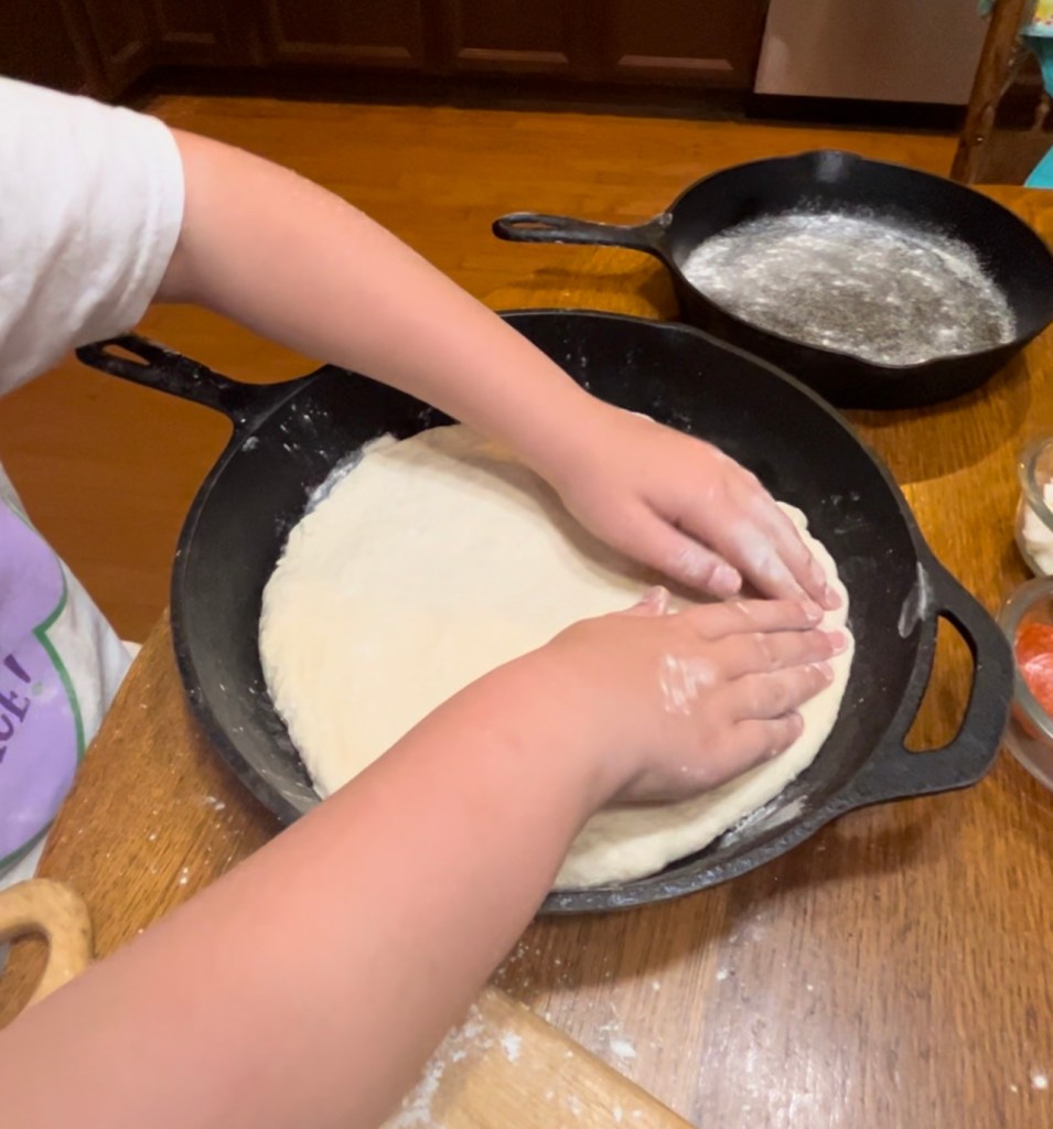 FORM each ball into a 12 inch pizza dough shell. ( We used 2 large black cast iron skillets.)–We actually divided the dough into two unequal pieces–a ball of 2/3 of the dough went into our large 13″ skillet. The left over ball of 1/3 of the dough went into a 10″ skillet. This worked out perfectly! If you do not have a cast iron skillet, a cookie sheet dusted with cornmeal will work. (No grease! Just dust with cornmeal.)