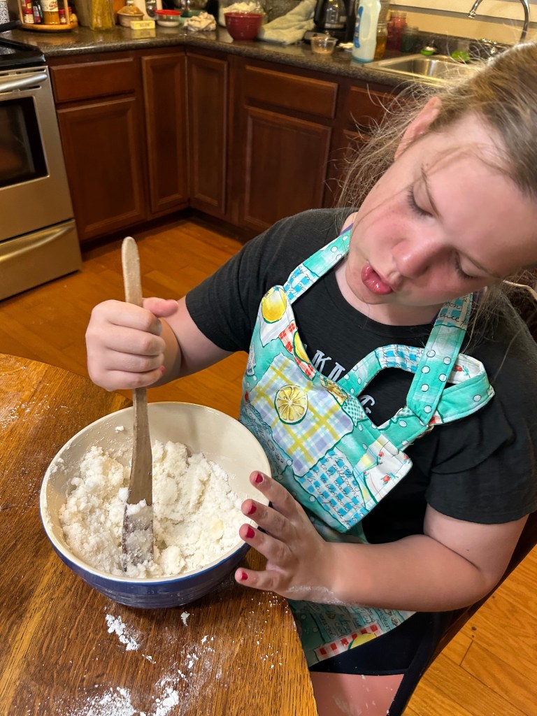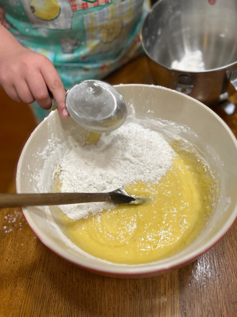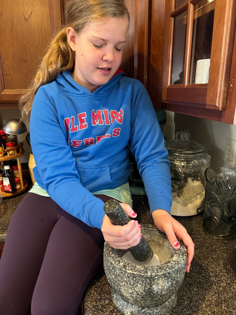 TIP: We had no caster sugar on hand, but it is easy to make! Bella put 1/4 C. plain granulated sugar into our mortar and used the pestle to grind it into a finer grain. Powdered sugar is too fine.
