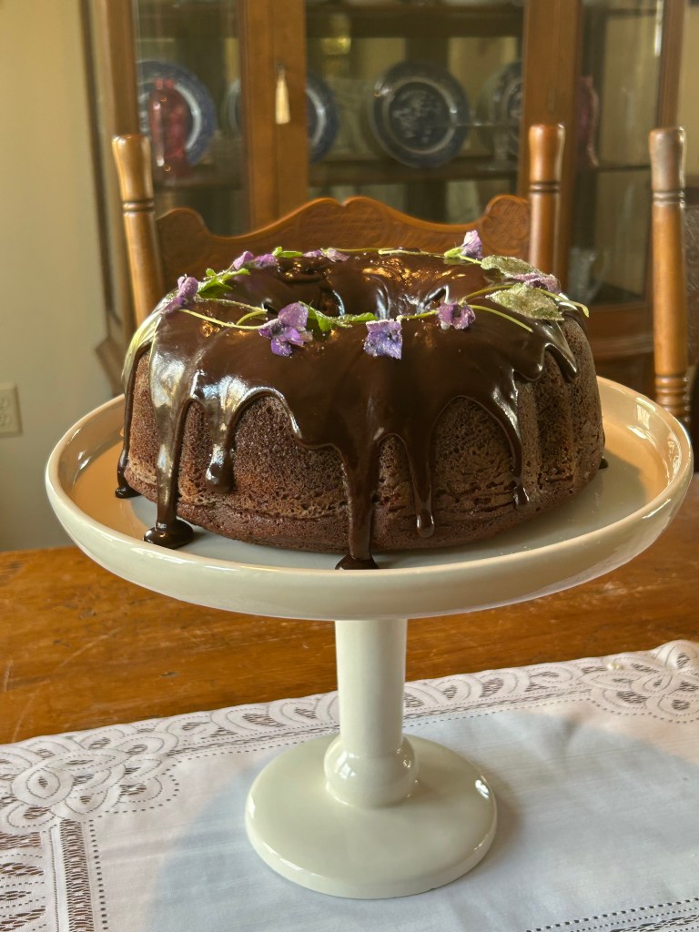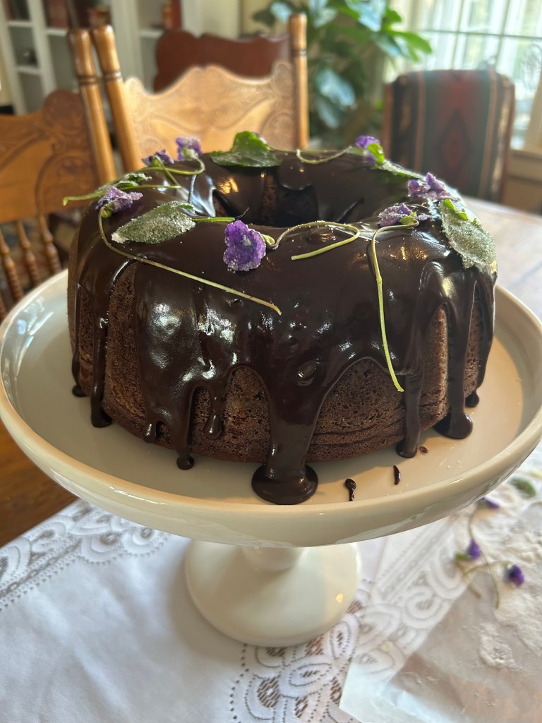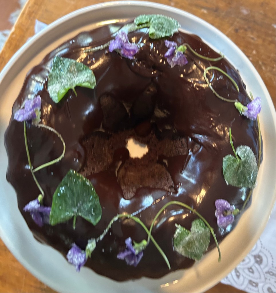I think the key may be starting with really pretty wild edibles as garnishes. So far, we have baked a redbud cake, and today, this chocolate cake with crystalized wild violets.