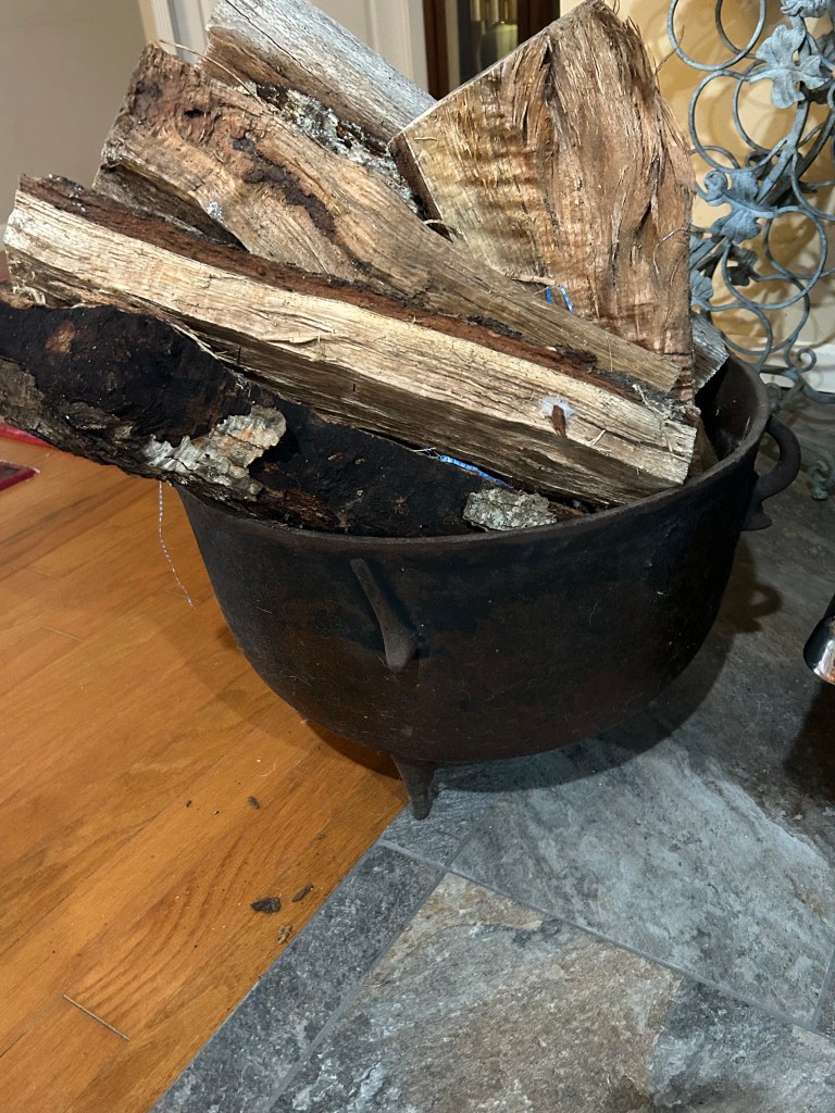 The two black washpots on either side of the stove belonged to each of my grandmothers. I am using them for firewood and for kindling. The pot on the left is a much heavier pot. My dad’s mother, Nanny, used it to wash clothes.