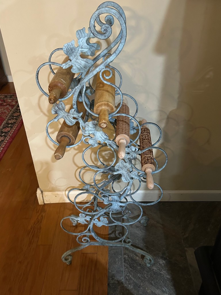 There is still one area that I am not satisfied with. I have rolling pins displayed in a wrought iron wine rack. It seems out of place to me, so my next project is to build a wooden rack for the rolling pins. There is a long area on the wall to the right side of the stove where I think this would look good. I guess it is yard sale time for the wine rack!