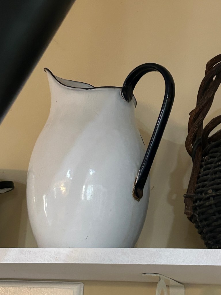 I will continue to collect enamel cookware and utensils. I especially want to find a white enamel dipper with a red rim. My old aunt kept one of these in a water bucket on the back porch. Everyone drank from the same dipper. When you finished drinking, you swirled the water around in the dipper and give it a sling into the yard.